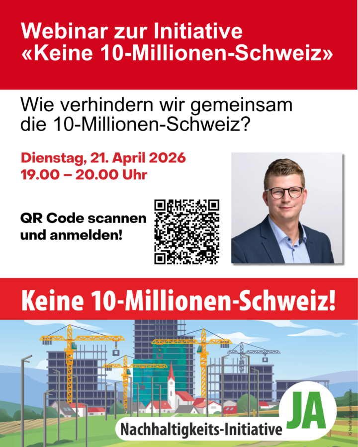 Jetzt gilt es ernst: Der Abstimmungstermin unserer Nachhaltigkeits-Initiative «Keine 10-Millionen-Schweiz!» rückt näher. Noch können wir handeln – bevor eine 10-Millionen-Schweiz mit noch mehr Dichtestress, Wohnungsnot und steigender Kriminalität Realität wird.